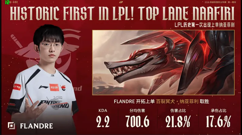 2.Flandre在上一场比赛使用纳亚菲利打上单,此为LPL首次